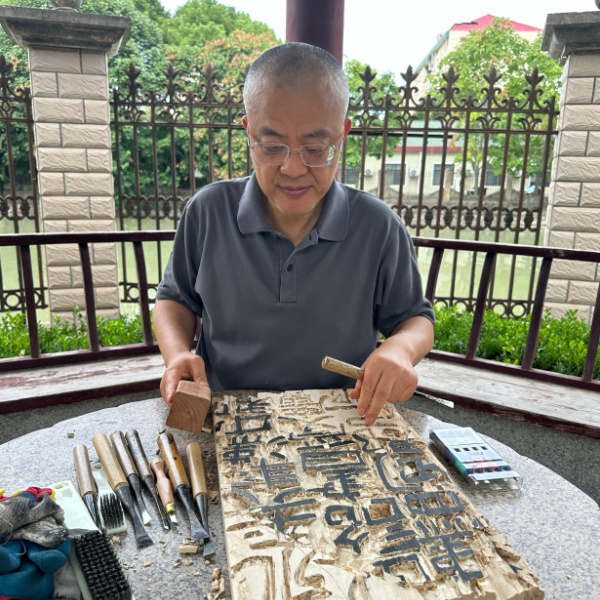 1962年、上海市生まれ。祖籍は浙江省余姚。華東師範大学中国語学科を卒業後、上海戯劇学院書法研究生課程を修了。2013年、清華大学美術学院刻字芸術高級研修班で王志安氏に師事し、書・構成・篆刻・彫刻・色彩を融合した総合芸術としての刻字を学ぶ。幼少より書に親しみ、五歳で外祖父に筆を学ぶ。2011年、上海市書法家協会に刻字専門委員会が設立されると初代副主任を務め、教育と創作の両面で発展に寄与。これまでに500点を超える作品を制作し、2019年には「板上心語」三人刻字展を開催するなど、日中の文化交流にも積極的に取り組んでいる。